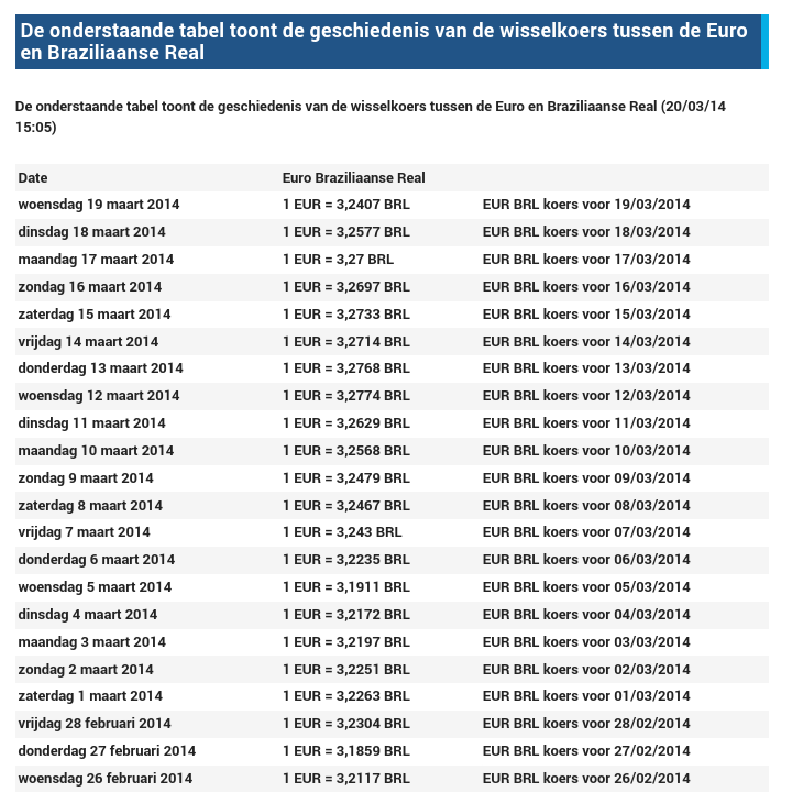 In Brazilie hanteren ze een middenkoers van 0,05 cent op de euro koers. Oftewel bij een koers van 3,22 is de inkoopprijs 3,25 en de verkoopprijs zo’n 3,20. Dit is ongeveer 1,5%.