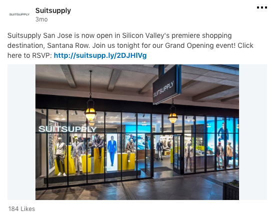 - Zorg dat de formaten van de posts goed zijn, zodat het er gelikt uitziet. Veel bedrijven hebben een leger aan communicatie specialisten die elk ‘woordje’ en kleur gebruik onder de loep nemen. Een fatsoenlijk foto formaat blijkt toch lastig. Formaat is gewoon te googlen, maar anders bij deze 1200×628 (voor desktop en mobiel). Dat formaat geldt dus voor HEMA. En bij Suitsupply mag het ook wel iets meer ‘Tailored fit’.