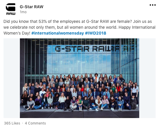 - Als je post, kijk ook of je er een call-to-action aan kunt plakken, zodat je mensen motiveert om actie te ondernemen. G-Star had ook wat problemen met het vinden van de juiste maat. Maar had hier bijvoorbeeld ook nog een link kunnen plaatsen als in “We are always looking for talented women (and men)”, see our job vacancies (met een link erbij).