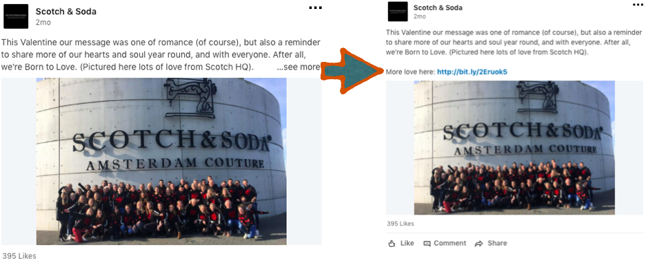 - En als je een call-to-action plaatst zorg dat foto’s klikbaar geplaatst worden. Dit is een slimme manier om traffic naar de landingspagina te genereren. Dus als je een link hebt plaats deze in de tekst (voordat je een foto plaatst), verander de foto die wordt up-geload vervolgens en verwijder de link weer in de tekst. Dat scheelt weer een tussenstap en de foto staat gelijk in het goede formaat. ‘Oeps’ Scotch & Soda, zo niet dus. Voor de volgende keer? Scheelt namelijk weer een klik.